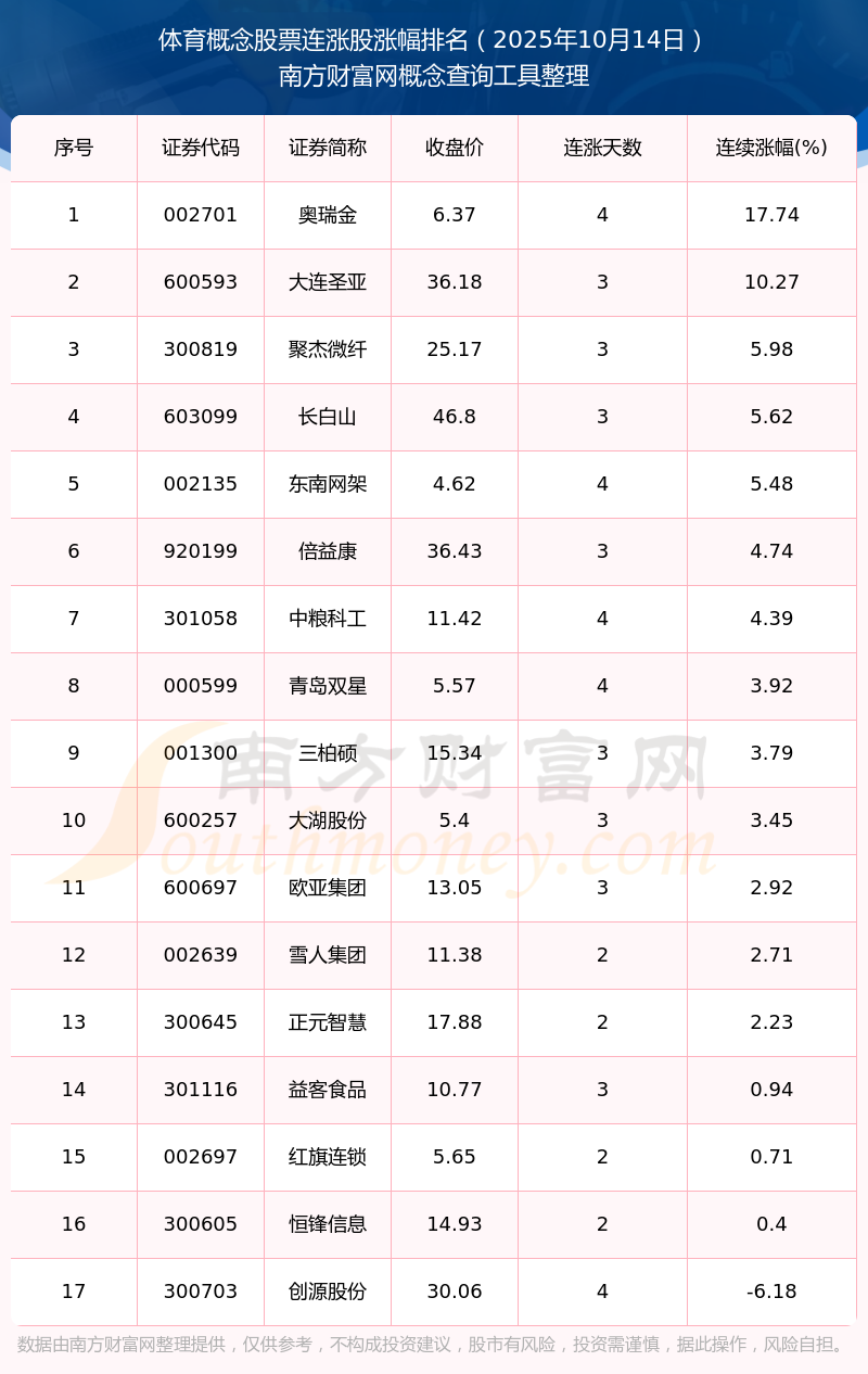 2025年10月14日體育概念股票連漲股漲幅排名
