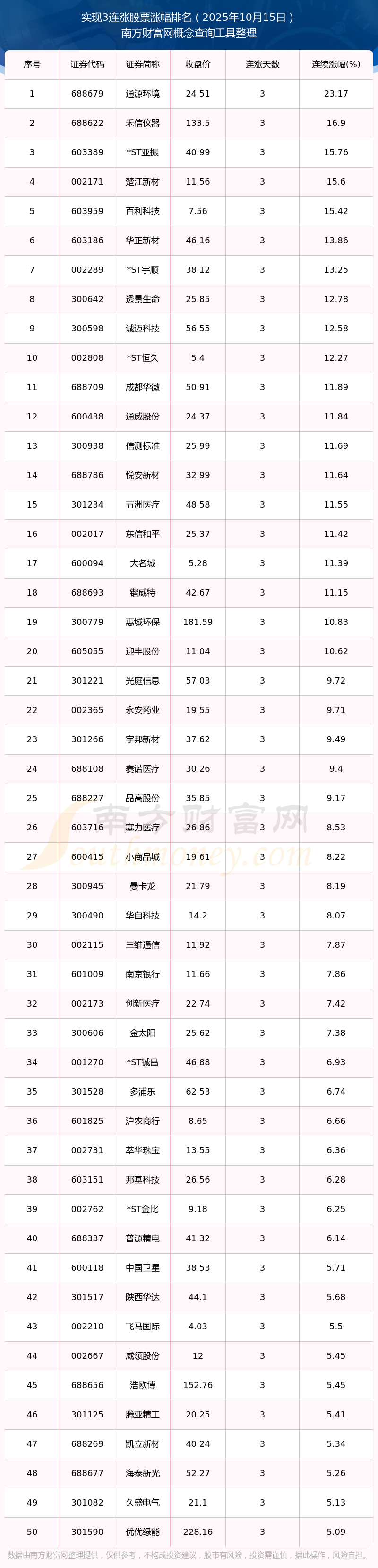 2025年10月15日實(shí)現(xiàn)3連漲股票漲幅排名