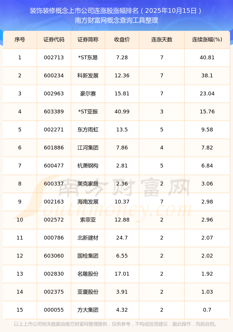 2025年10月15日裝飾裝修概念上市公司連漲股漲幅排名