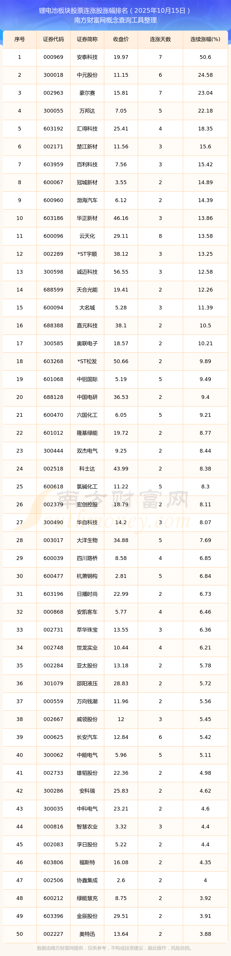 2025年10月15日鋰電池板塊股票連漲股漲幅排名