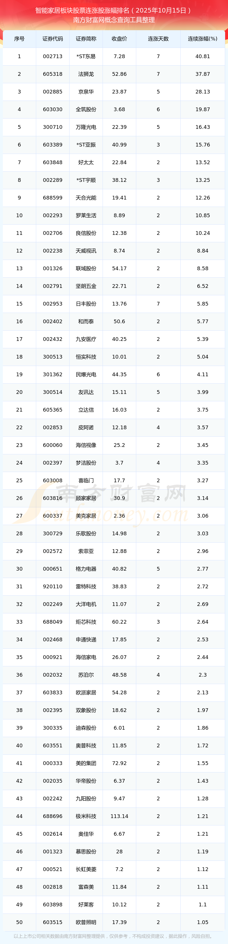 2025年10月15日智能家居板塊股票連漲股漲幅排名