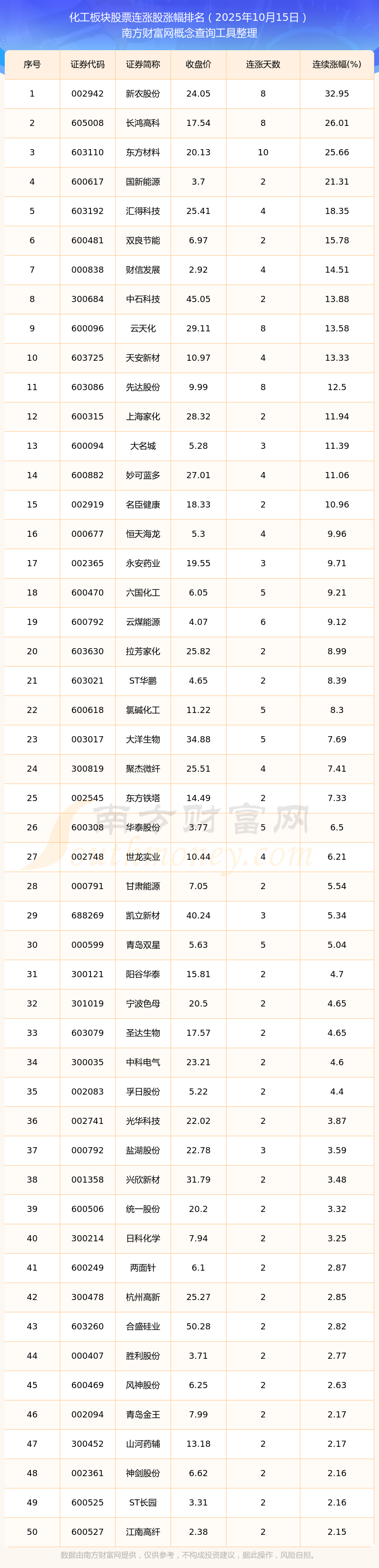 2025年10月15日化工板塊股票連漲股漲幅排名