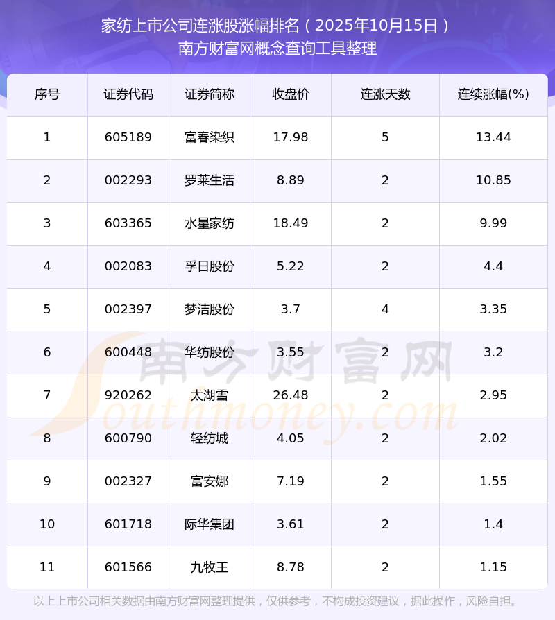 2025年10月15日家紡上市公司連漲股漲幅排名