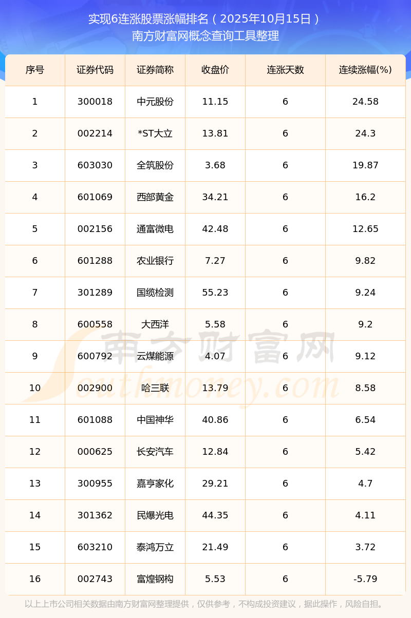 2025年10月15日實(shí)現(xiàn)6連漲股票漲幅排名