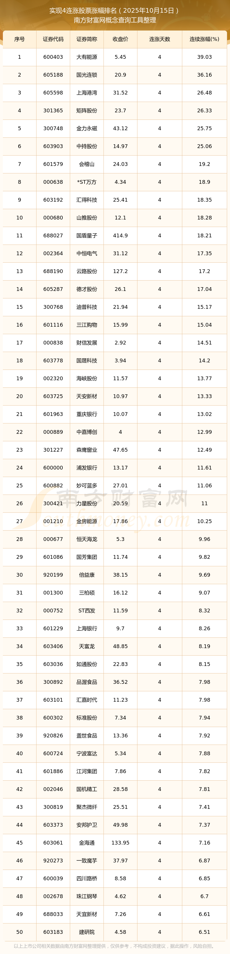 2025年10月15日實現(xiàn)4連漲股票漲幅排名