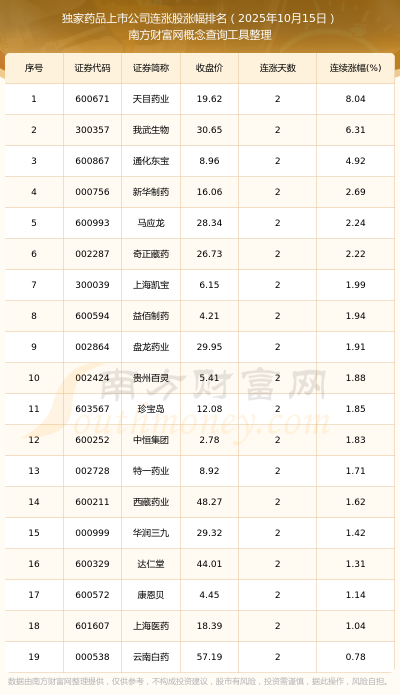 2025年10月15日獨(dú)家藥品上市公司連漲股漲幅排名