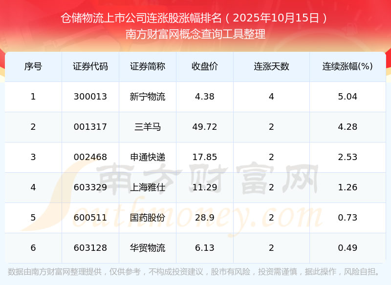 根據(jù)南方財富網(wǎng)概念查詢工具數(shù)據(jù)統(tǒng)計,截止2025年10月15日收盤,倉儲物流上市公司共有6只個股實現(xiàn)連漲。其中連續(xù)漲幅較大的個股有新寧物流、三羊馬、申通快遞等,連續(xù)漲幅分別為5.04%、4.28%、2.53%。