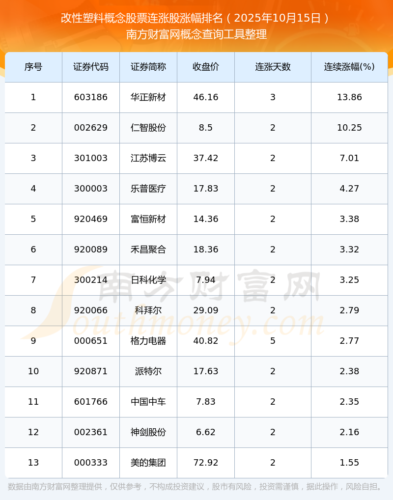 2025年10月15日改性塑料概念股票連漲股漲幅排名