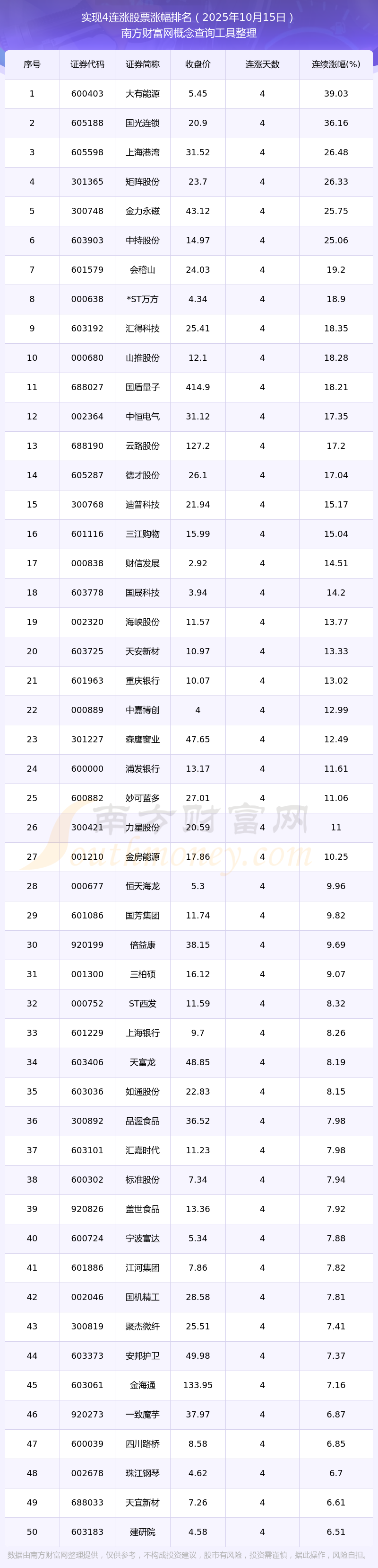 2025年10月15日實現(xiàn)4連漲股票漲幅排名