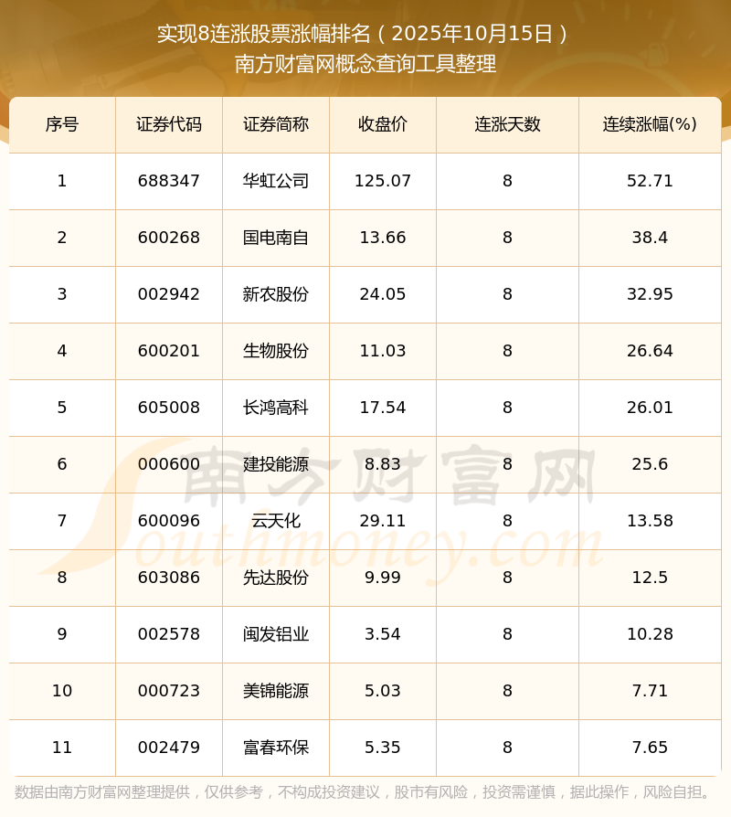 根據(jù)南方財(cái)富網(wǎng)概念查詢工具數(shù)據(jù)統(tǒng)計(jì),截止2025年10月15日收盤,共有11只個(gè)股實(shí)現(xiàn)8天連漲。其中連續(xù)漲幅較大的個(gè)股有華虹公司、國電南自、新農(nóng)股份等,連續(xù)漲幅分別為52.71%、38.40%、32.95%。