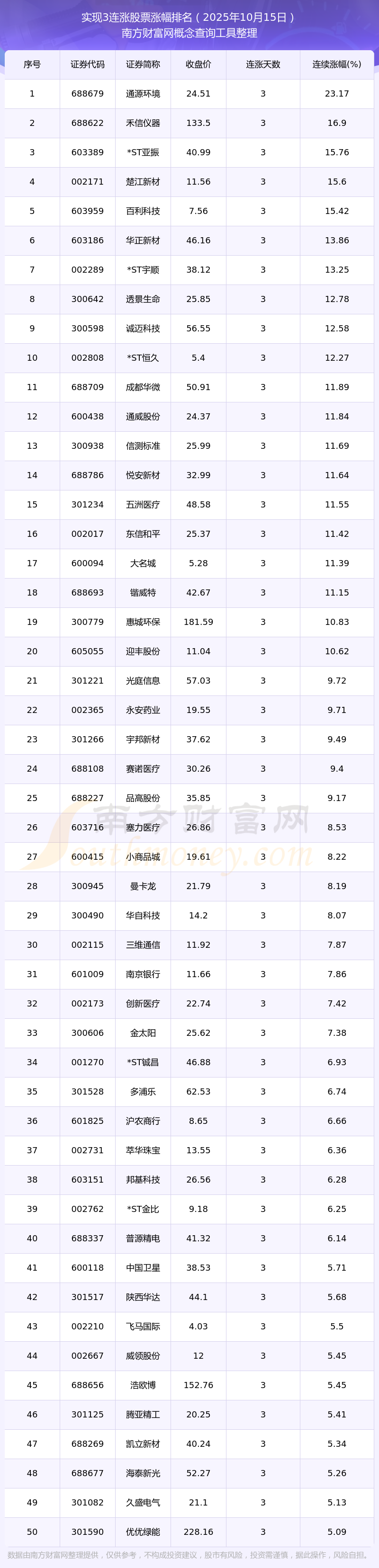 2025年10月15日實現(xiàn)3連漲股票漲幅排名