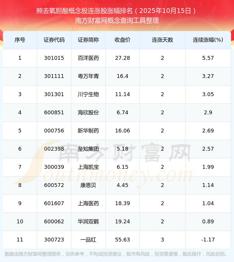 2025年10月15日熊去氧膽酸概念股連漲股漲幅排名
