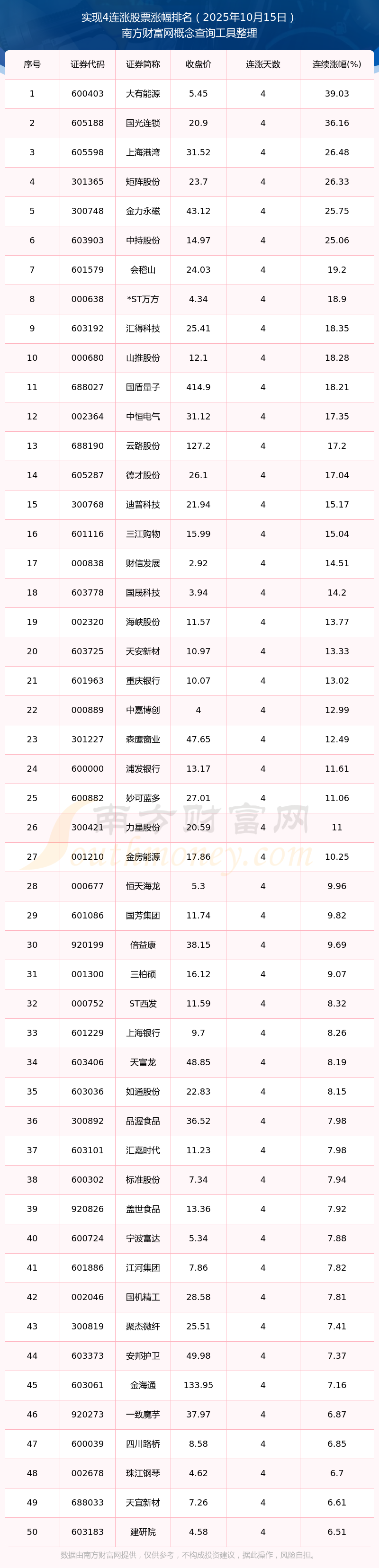 根據(jù)南方財(cái)富網(wǎng)概念查詢(xún)工具數(shù)據(jù)統(tǒng)計(jì),截止2025年10月15日收盤(pán),共有96只個(gè)股實(shí)現(xiàn)4天連漲。其中連續(xù)漲幅較大的個(gè)股有大有能源、國(guó)光連鎖、上海港灣等,連續(xù)漲幅分別為39.03%、36.16%、26.48%。