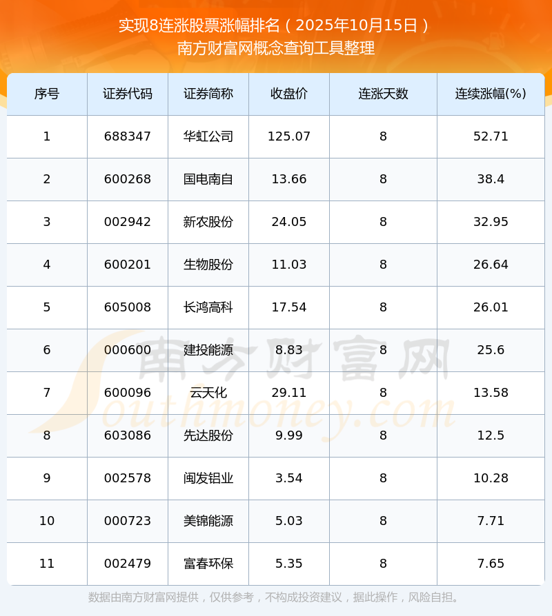 根據(jù)南方財富網(wǎng)概念查詢工具數(shù)據(jù)統(tǒng)計,截止2025年10月15日收盤,共有11只個股實現(xiàn)8天連漲。其中連續(xù)漲幅較大的個股有華虹公司、國電南自、新農(nóng)股份等,連續(xù)漲幅分別為52.71%、38.40%、32.95%。