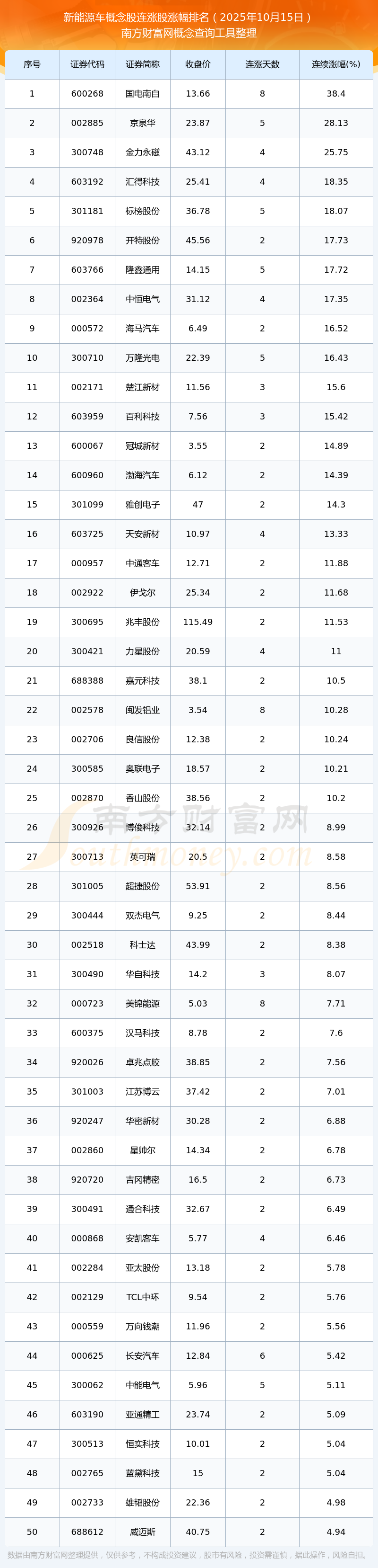 根據(jù)南方財富網(wǎng)概念查詢工具數(shù)據(jù)統(tǒng)計,截止2025年10月15日收盤,新能源車概念股共有109只個股實現(xiàn)連漲。其中連續(xù)漲幅較大的個股有國電南自、京泉華、金力永磁等,連續(xù)漲幅分別為38.40%、28.13%、25.75%。