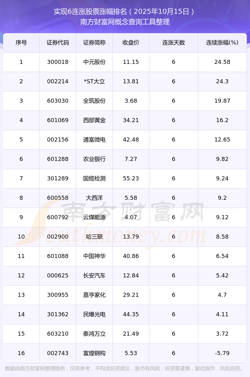 根據南方財富網概念查詢工具數據統計,截止2025年10月15日收盤,共有16只個股實現6天連漲。其中連續(xù)漲幅較大的個股有中元股份、*ST大立、全筑股份等,連續(xù)漲幅分別為24.58%、24.30%、19.87%。
