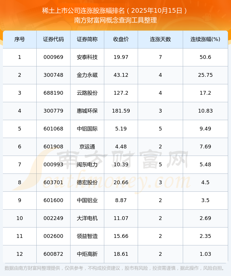 2025年10月15日稀土上市公司連漲股漲幅排名
