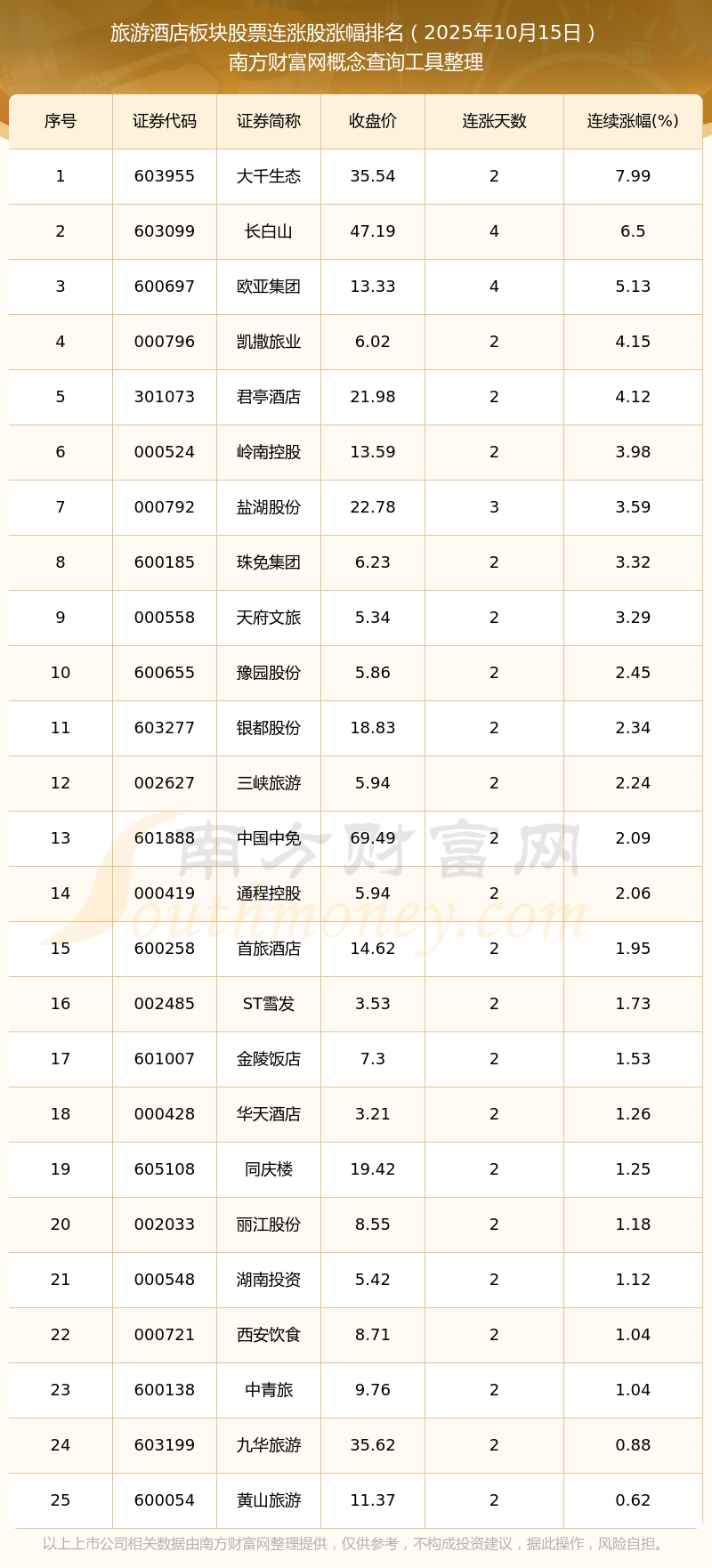 2025年10月15日旅游酒店板塊股票連漲股漲幅排名