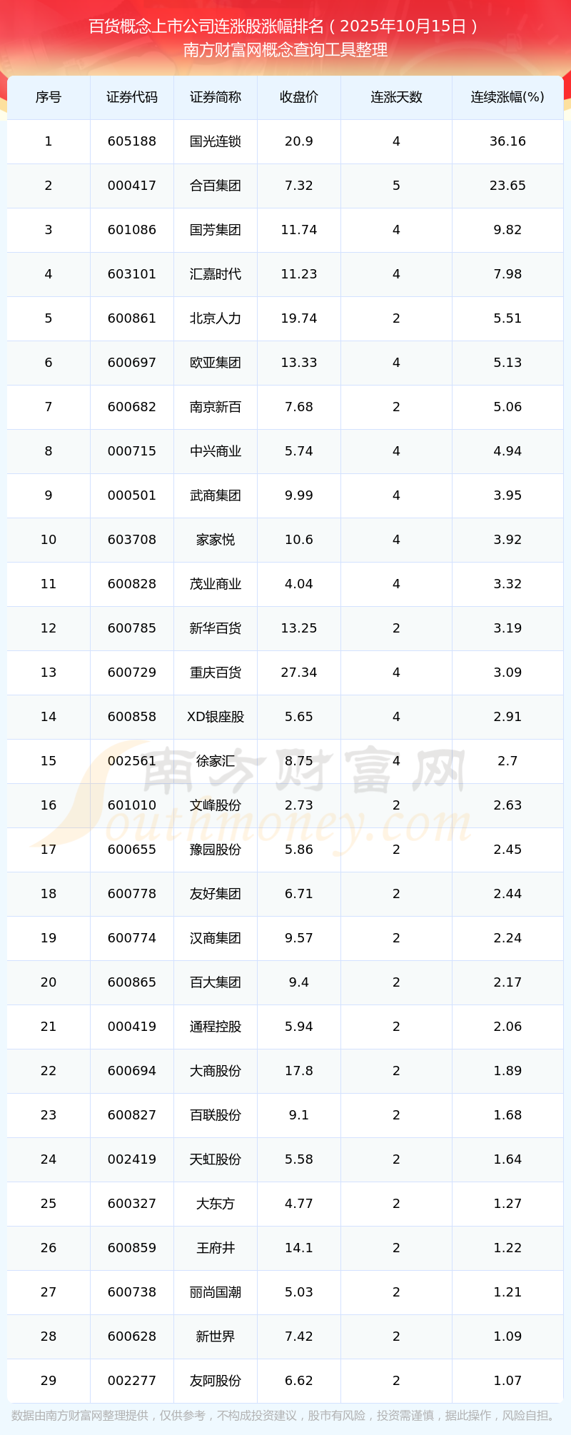 2025年10月15日百貨概念上市公司連漲股漲幅排名