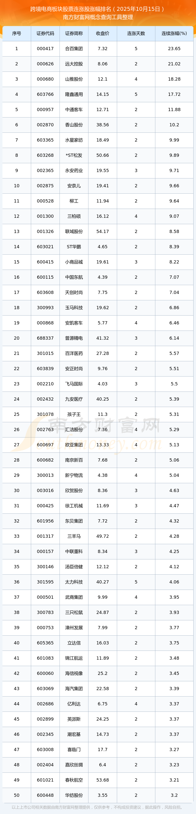 2025年10月15日跨境電商板塊股票連漲股漲幅排名