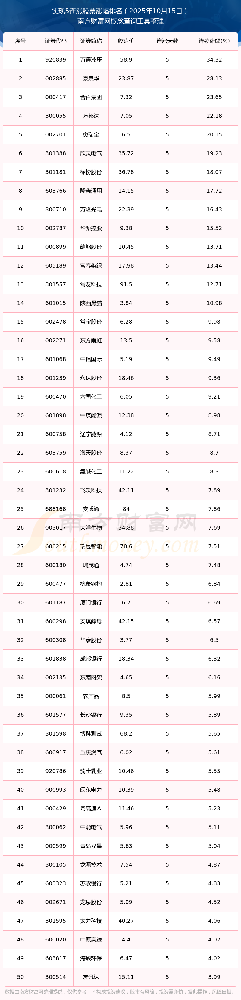 根據(jù)南方財富網(wǎng)概念查詢工具數(shù)據(jù)統(tǒng)計,截止2025年10月15日收盤,共有57只個股實現(xiàn)5天連漲。其中連續(xù)漲幅較大的個股有萬通液壓、京泉華、合百集團等,連續(xù)漲幅分別為34.32%、28.13%、23.65%。
