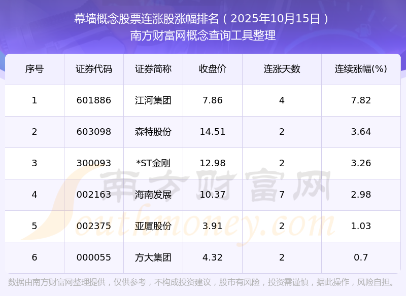 2025年10月15日幕墻概念股票連漲股票漲幅排名