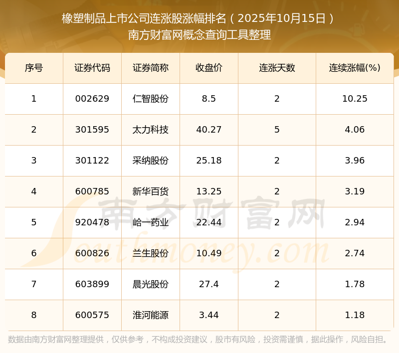 2025年10月15日橡塑制品上市公司連漲股漲幅排名
