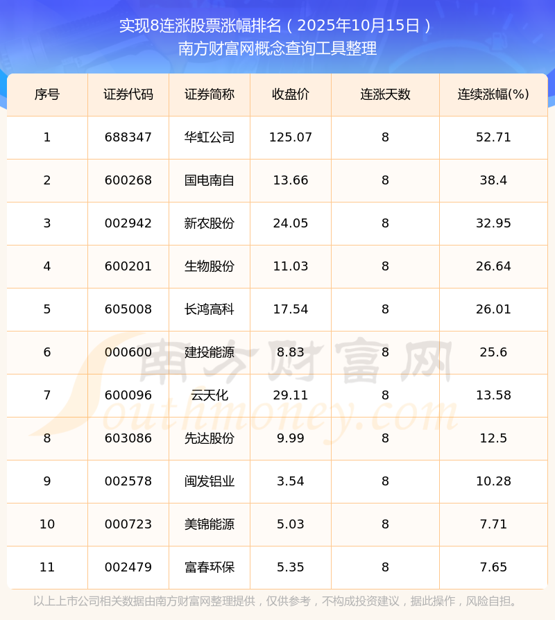 根據(jù)南方財(cái)富網(wǎng)概念查詢工具數(shù)據(jù)統(tǒng)計(jì),截止2025年10月15日收盤,共有11只個(gè)股實(shí)現(xiàn)8天連漲。其中連續(xù)漲幅較大的個(gè)股有華虹公司、國(guó)電南自、新農(nóng)股份等,連續(xù)漲幅分別為52.71%、38.40%、32.95%。
