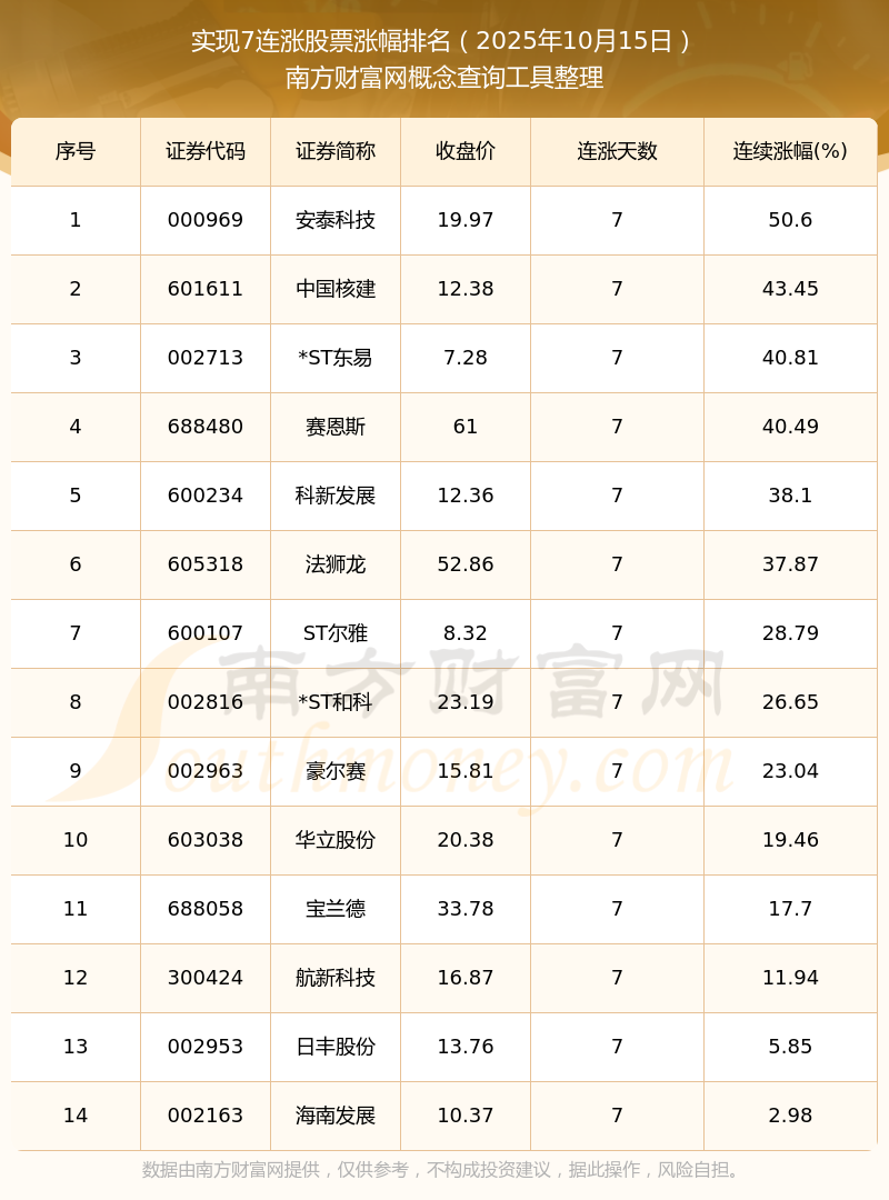 根據(jù)南方財(cái)富網(wǎng)概念查詢工具數(shù)據(jù)統(tǒng)計(jì),截止2025年10月15日收盤,共有14只個(gè)股實(shí)現(xiàn)7天連漲。其中連續(xù)漲幅較大的個(gè)股有安泰科技、中國核建、*ST東易等,連續(xù)漲幅分別為50.60%、43.45%、40.81%。