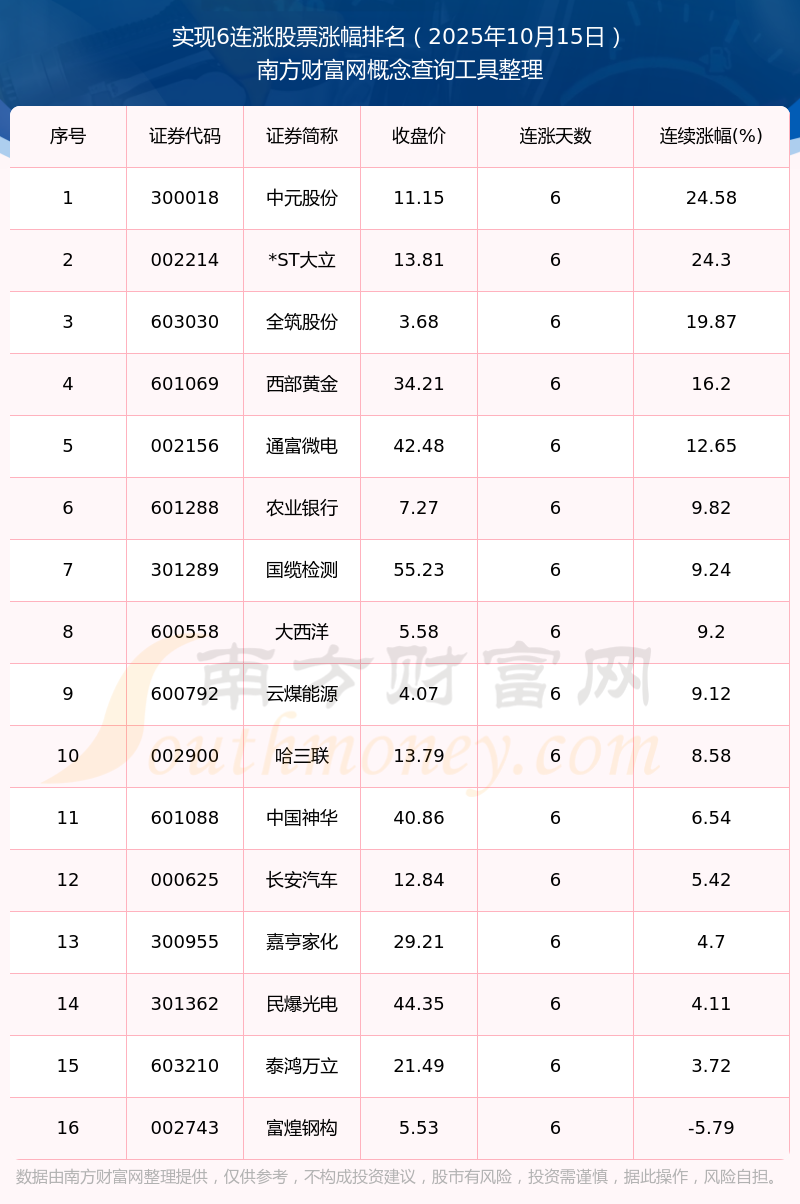 2025年10月15日實現(xiàn)6連漲股票漲幅排名
