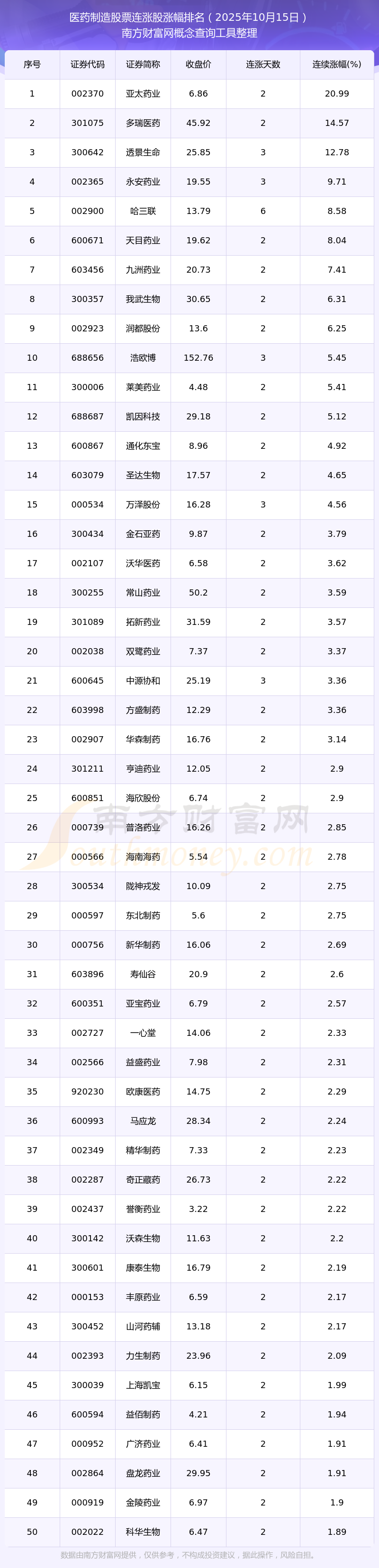 2025年10月15日醫(yī)藥制造股票連漲股漲幅排名