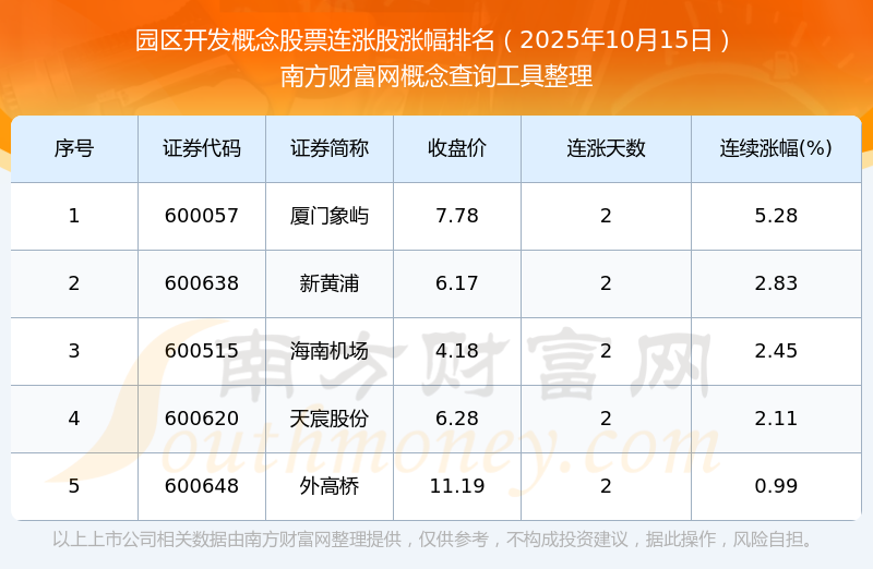 2025年10月15日園區(qū)開發(fā)概念股票連漲股漲幅排名