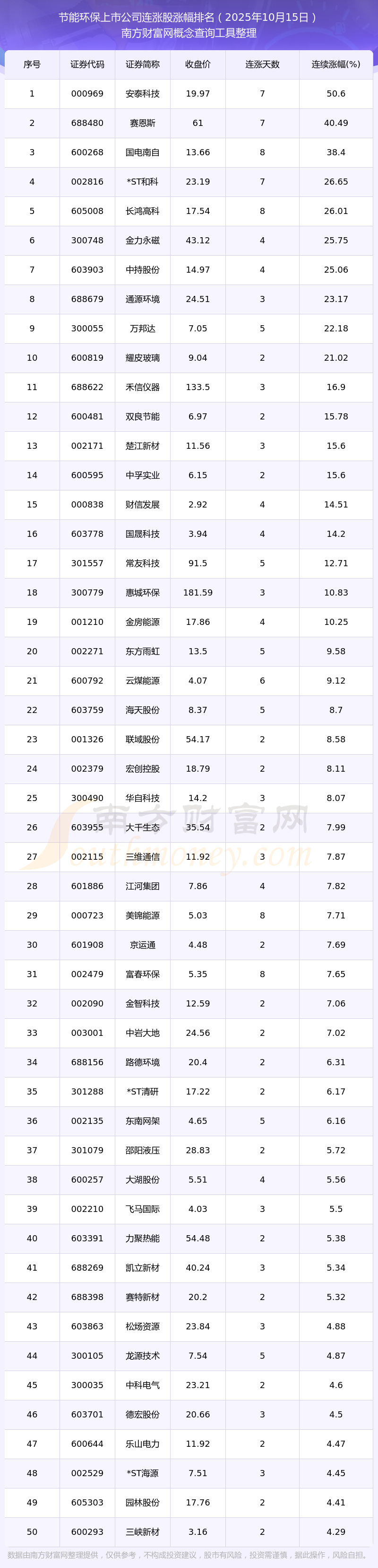 2025年10月15日節(jié)能環(huán)保上市公司連漲股漲幅排名