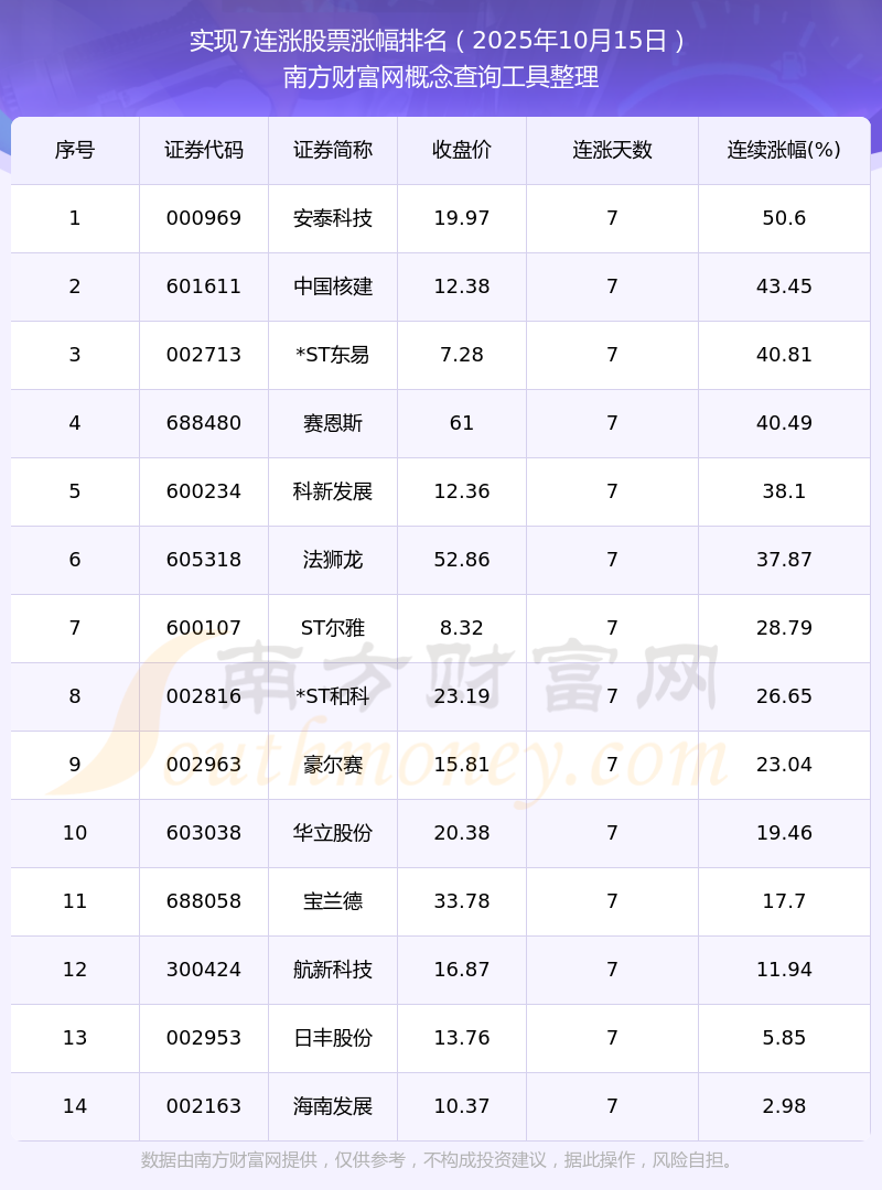 根據(jù)南方財富網(wǎng)概念查詢工具數(shù)據(jù)統(tǒng)計,截止2025年10月15日收盤,共有14只個股實現(xiàn)7天連漲。其中連續(xù)漲幅較大的個股有安泰科技、中國核建、*ST東易等,連續(xù)漲幅分別為50.60%、43.45%、40.81%。