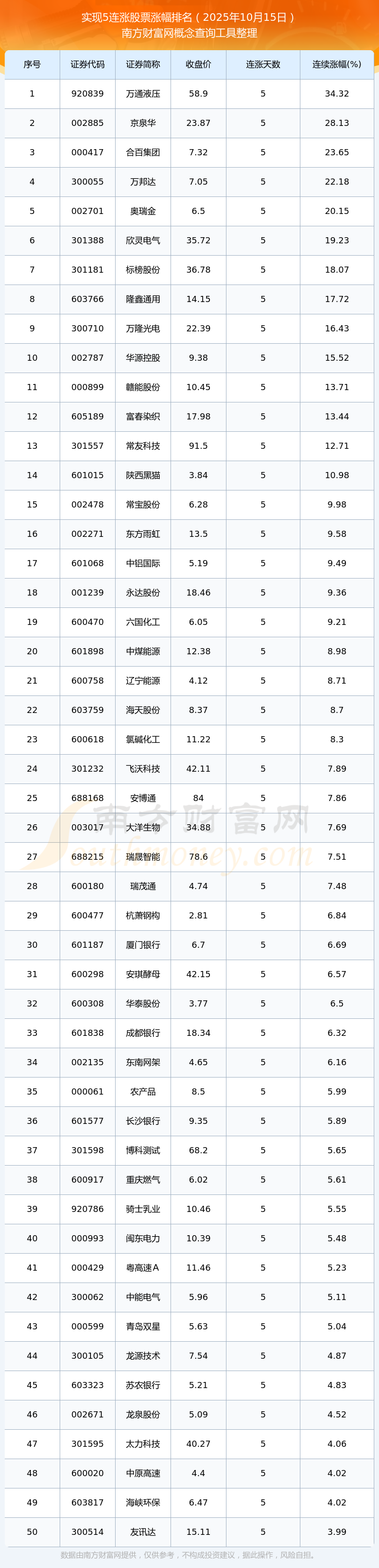 2025年10月15日實(shí)現(xiàn)5連漲股票漲幅排名