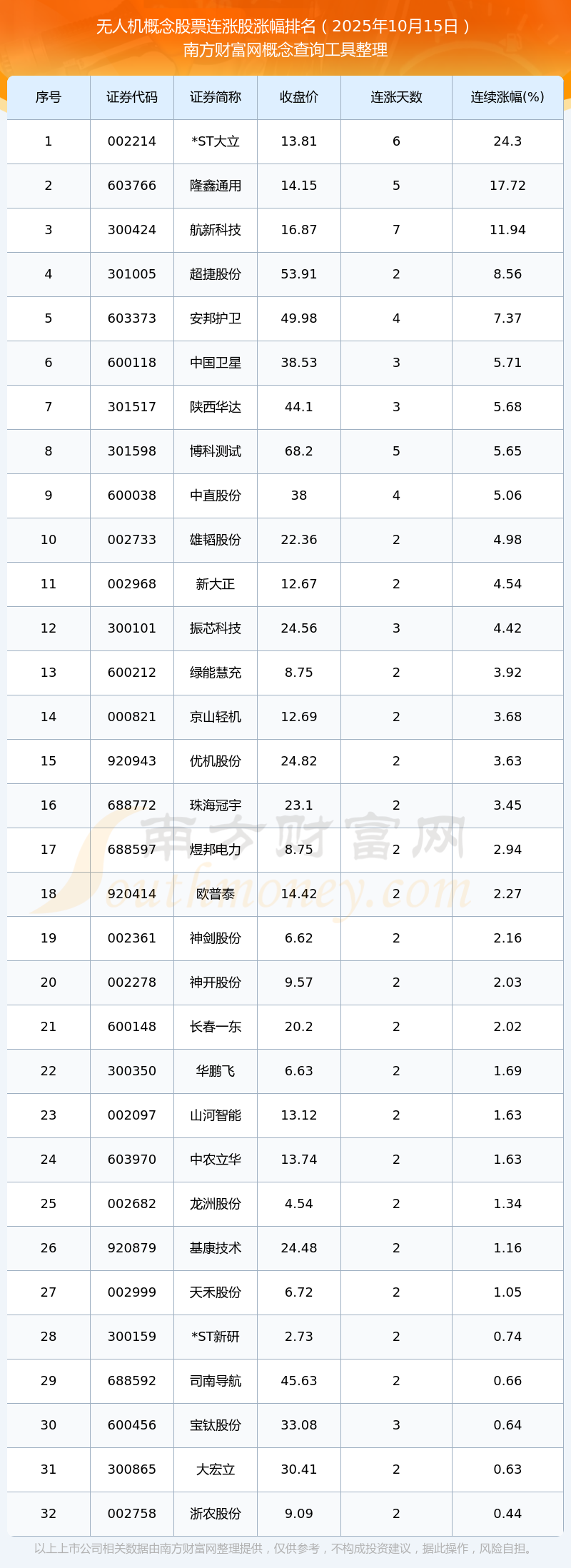 2025年10月15日無(wú)人機(jī)概念股票連漲股漲幅排名
