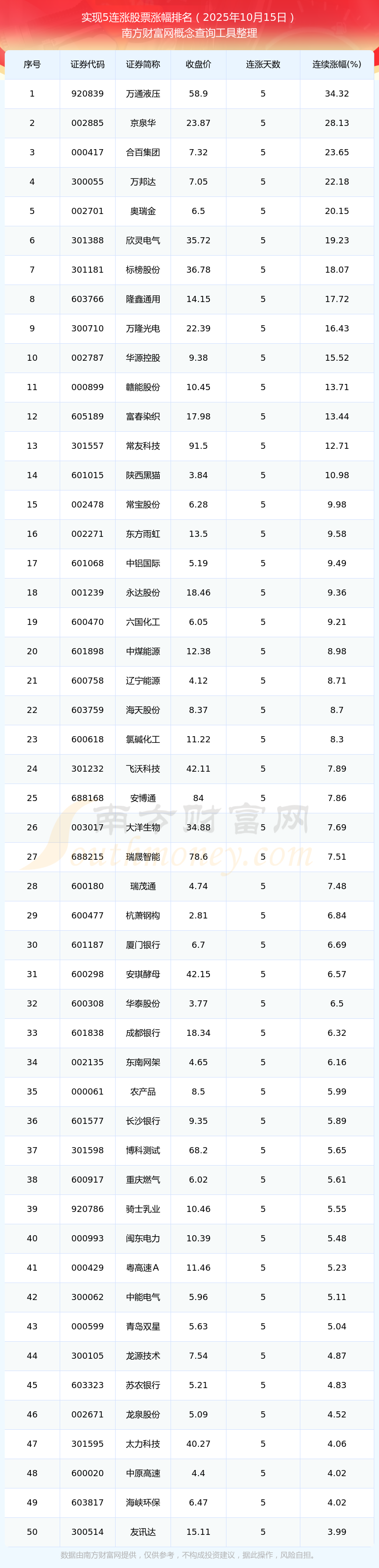 根據(jù)南方財富網(wǎng)概念查詢工具數(shù)據(jù)統(tǒng)計,截止2025年10月15日收盤,共有57只個股實現(xiàn)5天連漲。其中連續(xù)漲幅較大的個股有萬通液壓、京泉華、合百集團等,連續(xù)漲幅分別為34.32%、28.13%、23.65%。