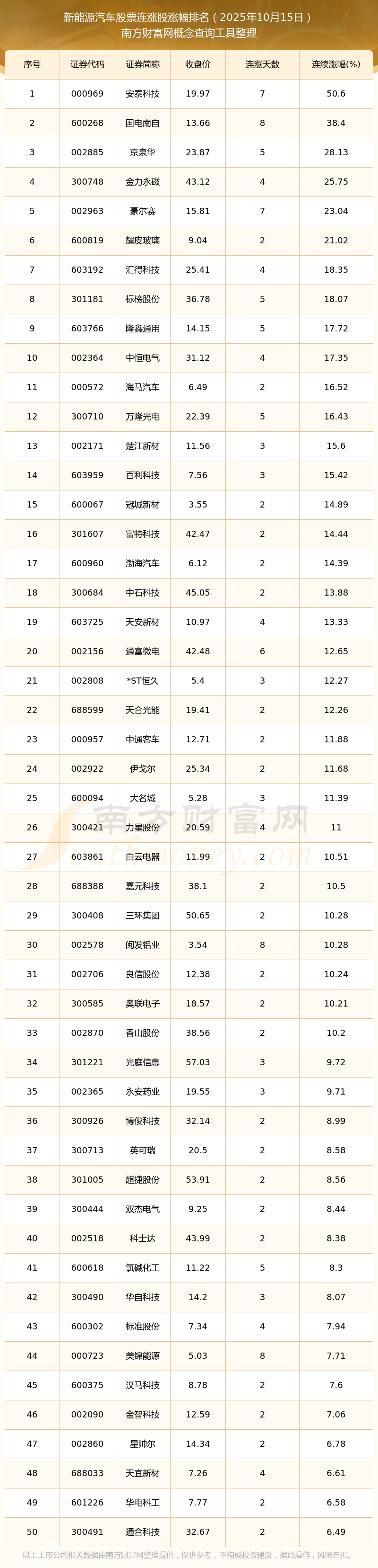 根據(jù)南方財(cái)富網(wǎng)概念查詢(xún)工具數(shù)據(jù)統(tǒng)計(jì),截止2025年10月15日收盤(pán),新能源汽車(chē)股票共有153只個(gè)股實(shí)現(xiàn)連漲。其中連續(xù)漲幅較大的個(gè)股有安泰科技、國(guó)電南自、京泉華等,連續(xù)漲幅分別為50.60%、38.40%、28.13%。
