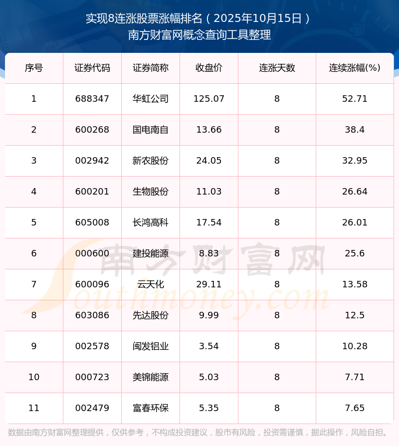 根據(jù)南方財(cái)富網(wǎng)概念查詢工具數(shù)據(jù)統(tǒng)計(jì),截止2025年10月15日收盤,共有11只個(gè)股實(shí)現(xiàn)8天連漲。其中連續(xù)漲幅較大的個(gè)股有華虹公司、國(guó)電南自、新農(nóng)股份等,連續(xù)漲幅分別為52.71%、38.40%、32.95%。