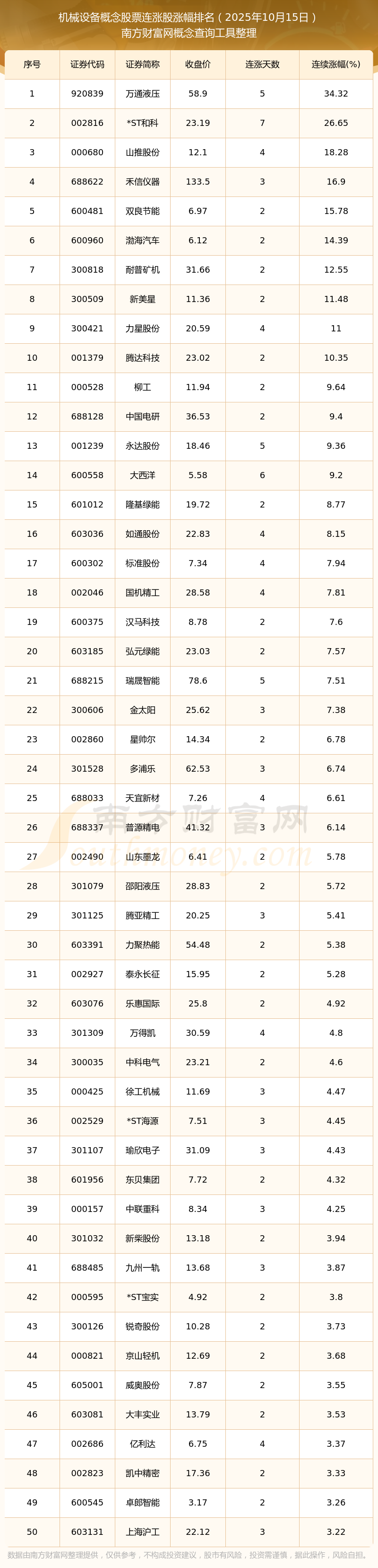 2025年10月15日機(jī)械設(shè)備概念股票連漲股漲幅排名