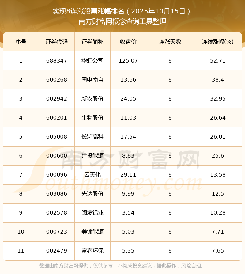 2025年10月15日實現(xiàn)8連漲股票漲幅排名
