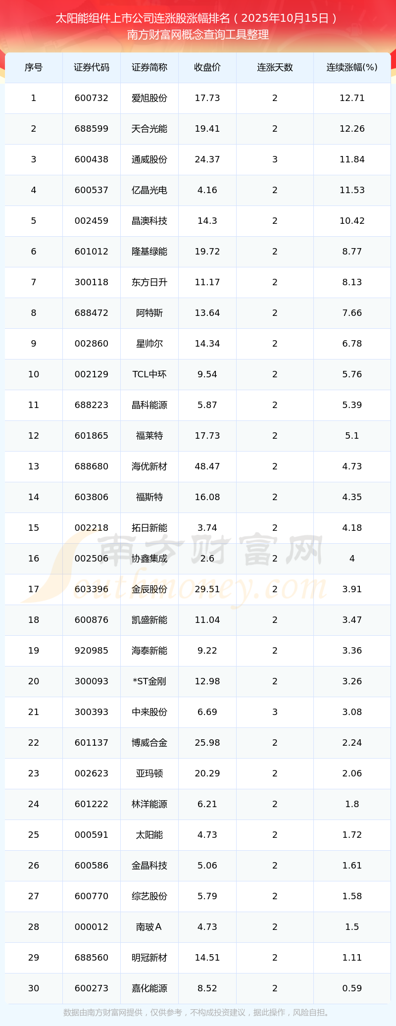 2025年10月15日太陽(yáng)能組件上市公司連漲股漲幅排名