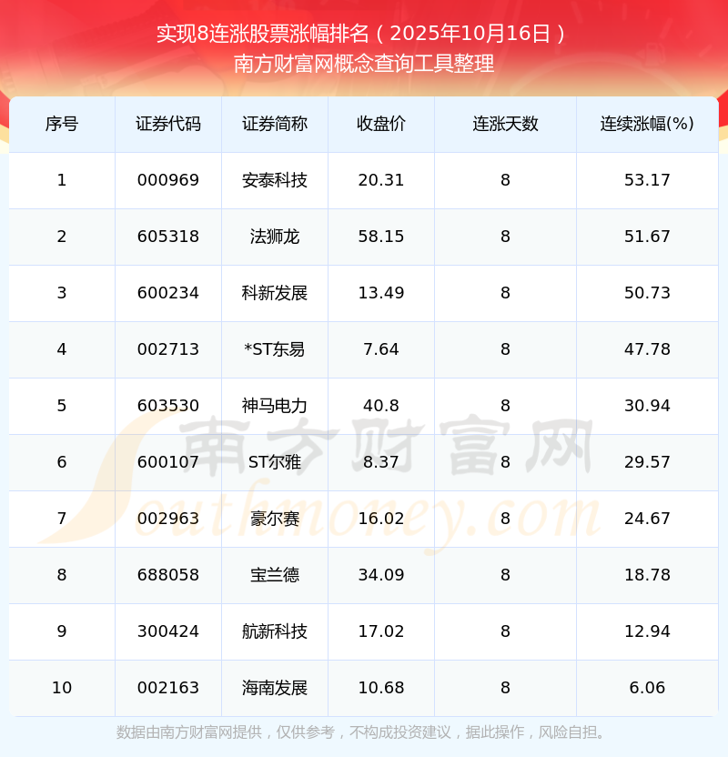 2025年10月16日實(shí)現(xiàn)8連漲股票漲幅排名