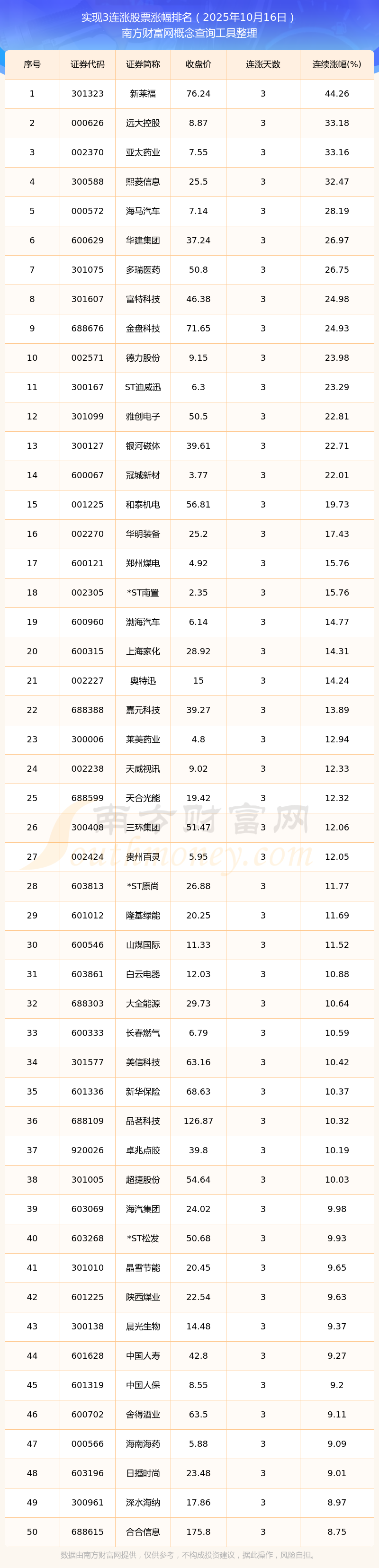 2025年10月16日實(shí)現(xiàn)3連漲股票漲幅排名