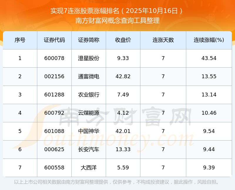 根據(jù)南方財(cái)富網(wǎng)概念查詢工具數(shù)據(jù)統(tǒng)計(jì),截止2025年10月16日收盤,共有7只個股實(shí)現(xiàn)7天連漲。其中連續(xù)漲幅較大的個股有澄星股份、通富微電、農(nóng)業(yè)銀行等,連續(xù)漲幅分別為43.54%、13.55%、13.14%。