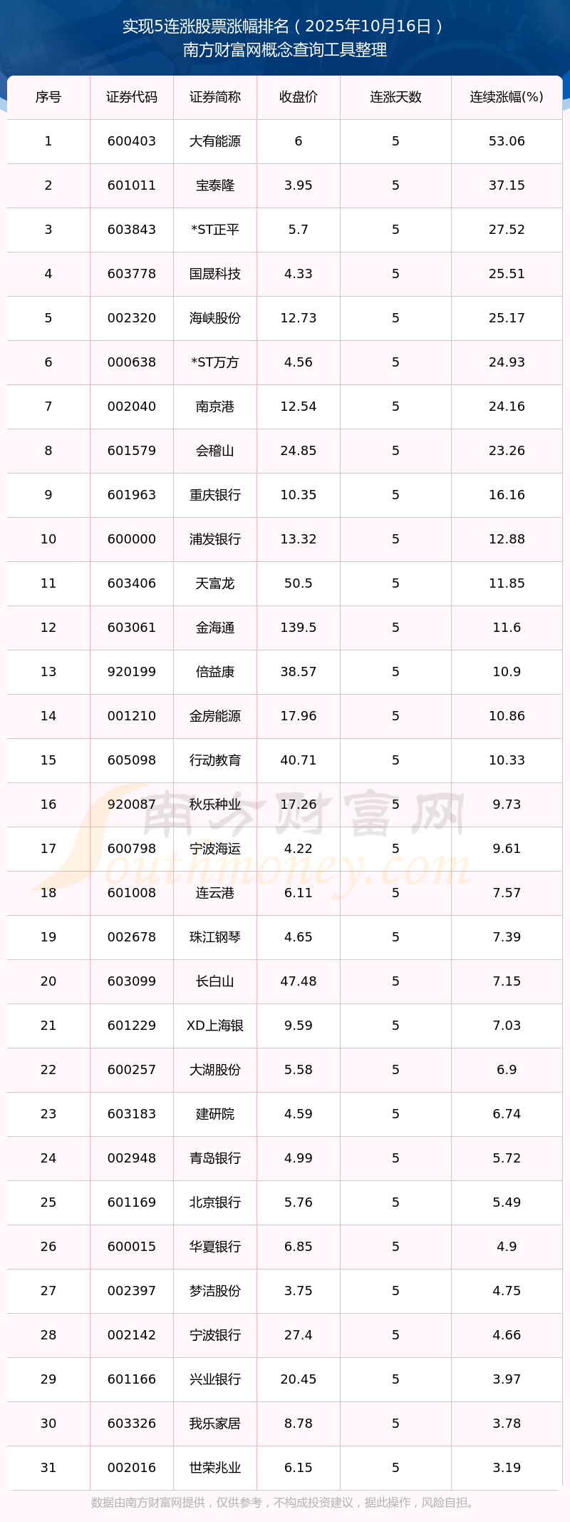 根據(jù)南方財富網(wǎng)概念查詢工具數(shù)據(jù)統(tǒng)計,截止2025年10月16日收盤,共有31只個股實現(xiàn)5天連漲。其中連續(xù)漲幅較大的個股有大有能源、寶泰隆、*ST正平等,連續(xù)漲幅分別為53.06%、37.15%、27.52%。