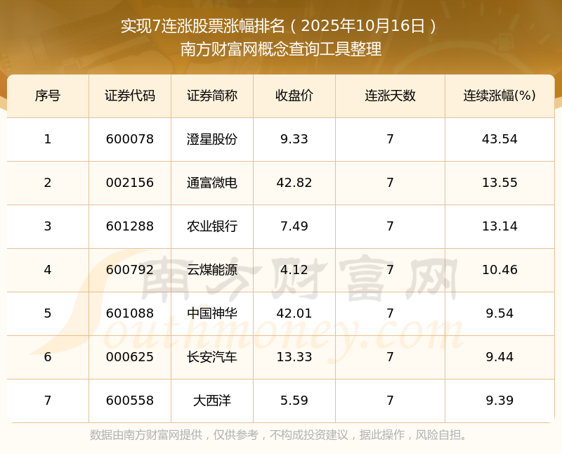 根據(jù)南方財(cái)富網(wǎng)概念查詢工具數(shù)據(jù)統(tǒng)計(jì),截止2025年10月16日收盤,共有7只個(gè)股實(shí)現(xiàn)7天連漲。其中連續(xù)漲幅較大的個(gè)股有澄星股份、通富微電、農(nóng)業(yè)銀行等,連續(xù)漲幅分別為43.54%、13.55%、13.14%。