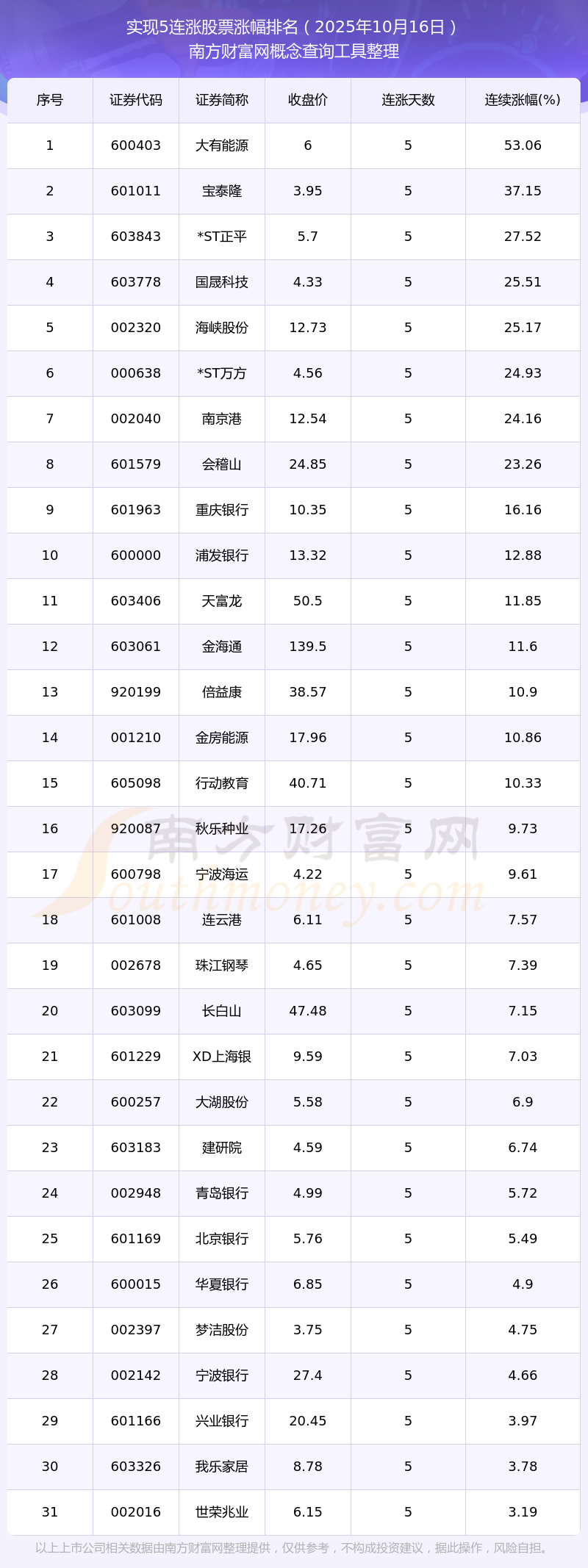 根據(jù)南方財(cái)富網(wǎng)概念查詢工具數(shù)據(jù)統(tǒng)計(jì),截止2025年10月16日收盤,共有31只個(gè)股實(shí)現(xiàn)5天連漲。其中連續(xù)漲幅較大的個(gè)股有大有能源、寶泰隆、*ST正平等,連續(xù)漲幅分別為53.06%、37.15%、27.52%。