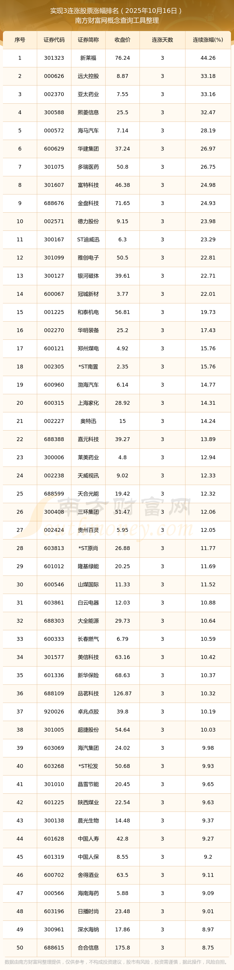 2025年10月16日實(shí)現(xiàn)3連漲股票漲幅排名