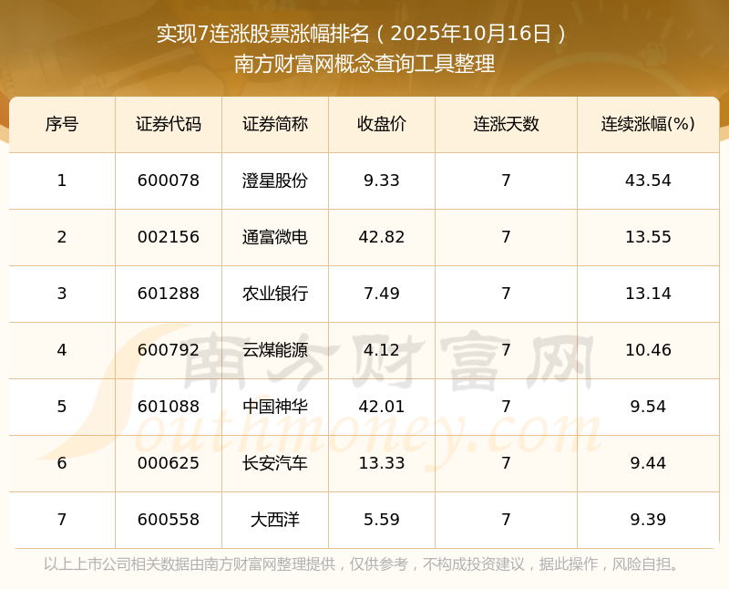 根據(jù)南方財富網(wǎng)概念查詢工具數(shù)據(jù)統(tǒng)計,截止2025年10月16日收盤,共有7只個股實(shí)現(xiàn)7天連漲。其中連續(xù)漲幅較大的個股有澄星股份、通富微電、農(nóng)業(yè)銀行等,連續(xù)漲幅分別為43.54%、13.55%、13.14%。
